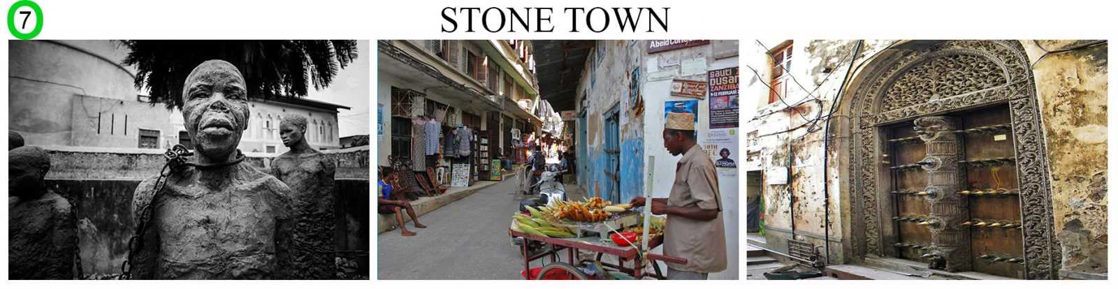 Plivajte sa delfinima na jugu Zanzibara, krenite na “Blue Safari”, uživajte u afričkoj kuhinji, “navalite” na papaju, ananas i avokado. Upoznajte crvene Colobus majmune, stanovnike Jozani šume koji se osim ovde ne mogu videti nigde na svetu. Zagrlite gigantske kornjače, jedine stanovnike obližnjeg Prison ostrva. Izgubite se u lavirintima ulica kamenog grada i zviždućući neku melodiju grupe Queen pronađite kuću u kojoj je rodjen Freddie Mercury… Stone Town je glavni i jedini grad na Zanzibaru i gotovo da se nije promenio u poslednjih 200 godina. U njemu pronađite tragove ne tako davne burne prošlosti. Pre samo 100 godina na Zanzibaru, u Kamenom gradu, se nalazila najveća pijaca robova na koju su dovođeni robovi iz čitave Afrike.